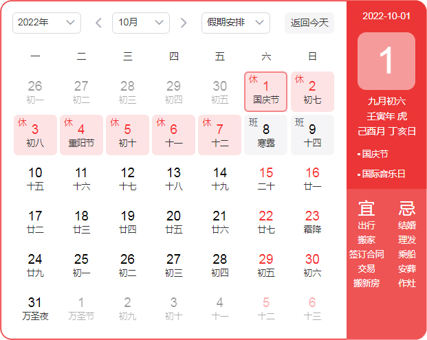 放假时间:2022年10月01日(周六)——2022年10月07日(周五),共七天。